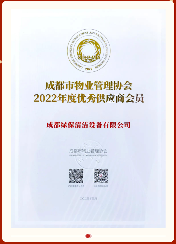 綠保榮獲《成都市物業(yè)管理協(xié)會(huì)2022年度優(yōu)秀供應(yīng)商會(huì)員》稱號(hào)!感謝成都市物業(yè)協(xié)會(huì)及管理部門(mén)頒發(fā)的榮譽(yù)!