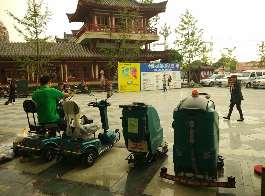 成都綠保清潔用品有限公司的自主品牌綠美保洗地機走進成都市崇州市唐人街,為唐人街每一個角落,打造舒適,高端旅游環境。LUROB綠美保R660B駕駛式洗地機作為小型駕駛式洗地機的標樣,擁有極高性價比,適合各種類型的地面清洗任務。能配合不同的刷子,